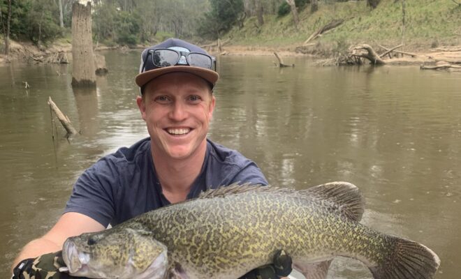 Photo: VRFish Executive Officer, Anthony McGrath, pictured with a Murray cod caught in the Goulburn River at natural water levels